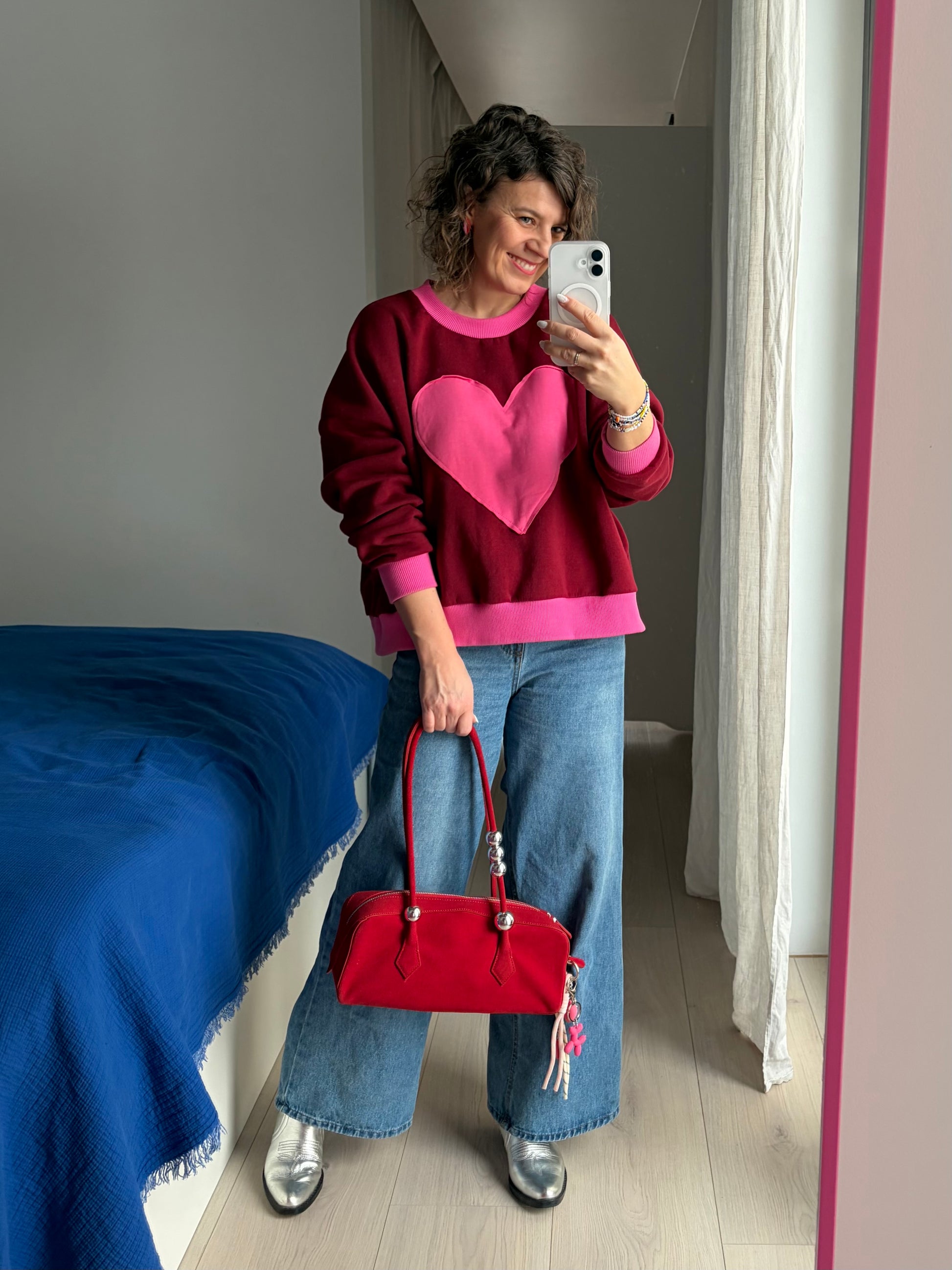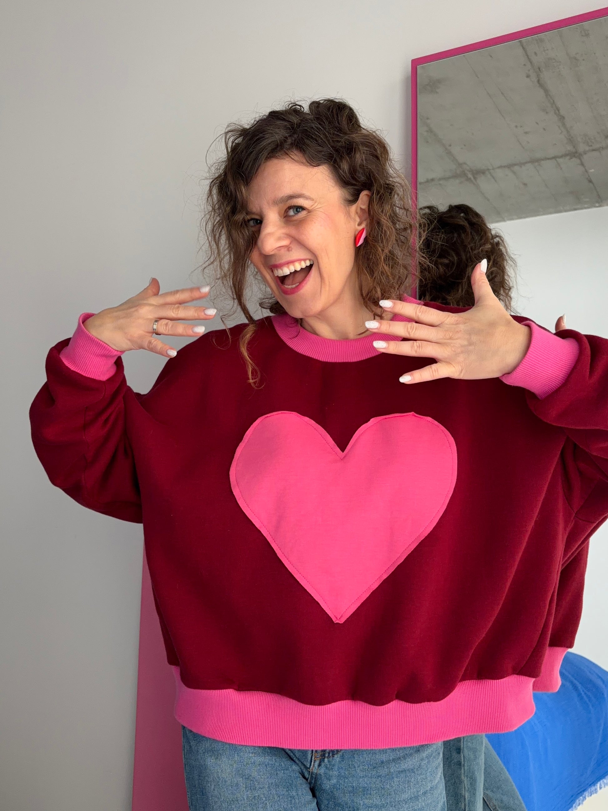 Oversizowa bluza w pięknym zestawie kolorystycznym z naszytym, różowym sercem 💕. Cudownie miękka, ciepła i wygodna. Uszyta z dresówki bawełnianej, drapanej - wykończonej wewnątrz mięciutkim meszkiem. Idealna do legginsów i jeansów na nadchodzący sezon.