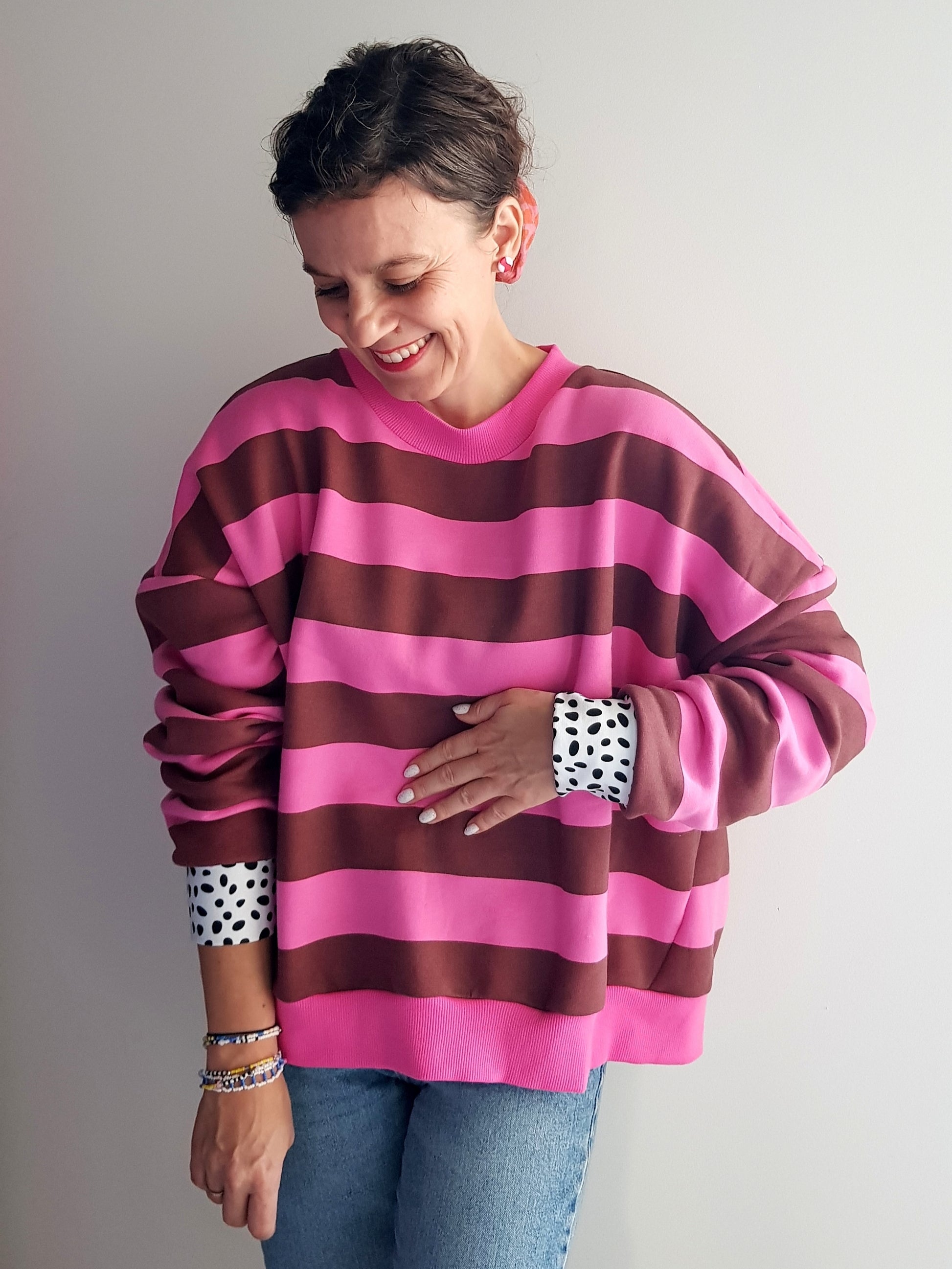 CHOCOOPINK - unikatowa bluza w paski o niepowtarzalnym zestawieniu wzorów i kolorów, bo...tutaj czekoladowe pasy na różowym tle spotykają pstroo.kate kropy na mankietach bluzy i dzieje się magia! A kiedy jeszcze jest Ci ciepło i wygodnie, a do tego możesz założyć swoje ulubione jeansy - masz wszystko!