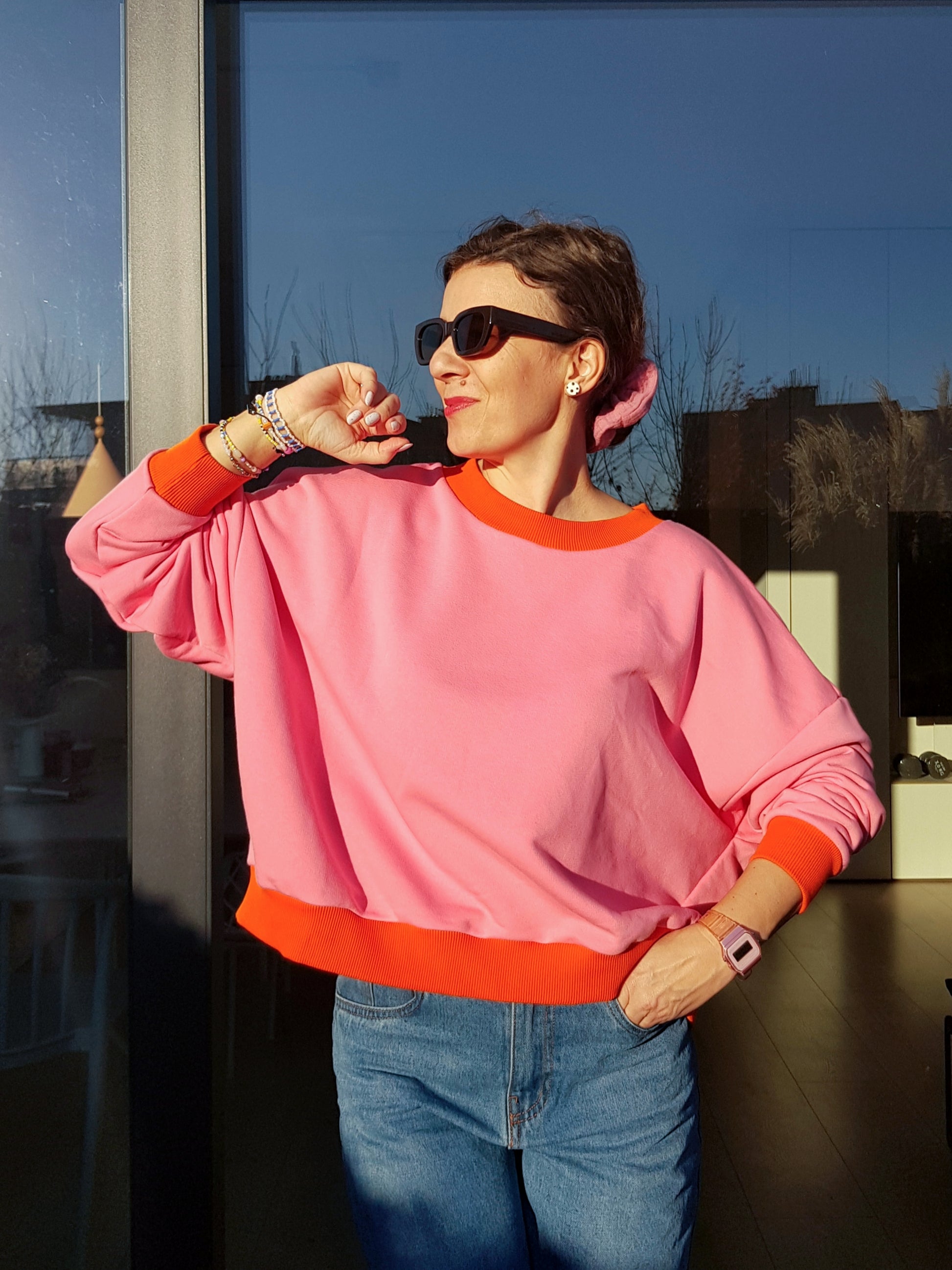 Oversizowa, krótka bluza YOKOO w kolorze różowym, z kontrastowymi wykończeniami (dekolt, mankiety) w kolorze pomarańczowym. 100% dobrej energii. Ciekawy, pudełkowy krój oraz surowe wykończenie dołu bluzy nada Twojej stylizacji unikalnego charakteru. Uszyta z wysokiej jakości dresówki bawełnianej z pętelką. Cudownie ciepła i miła w dotyku. Idealna na nadchodzący sezon. Dzięki temu projektowi wyróżnisz się z tłumu!